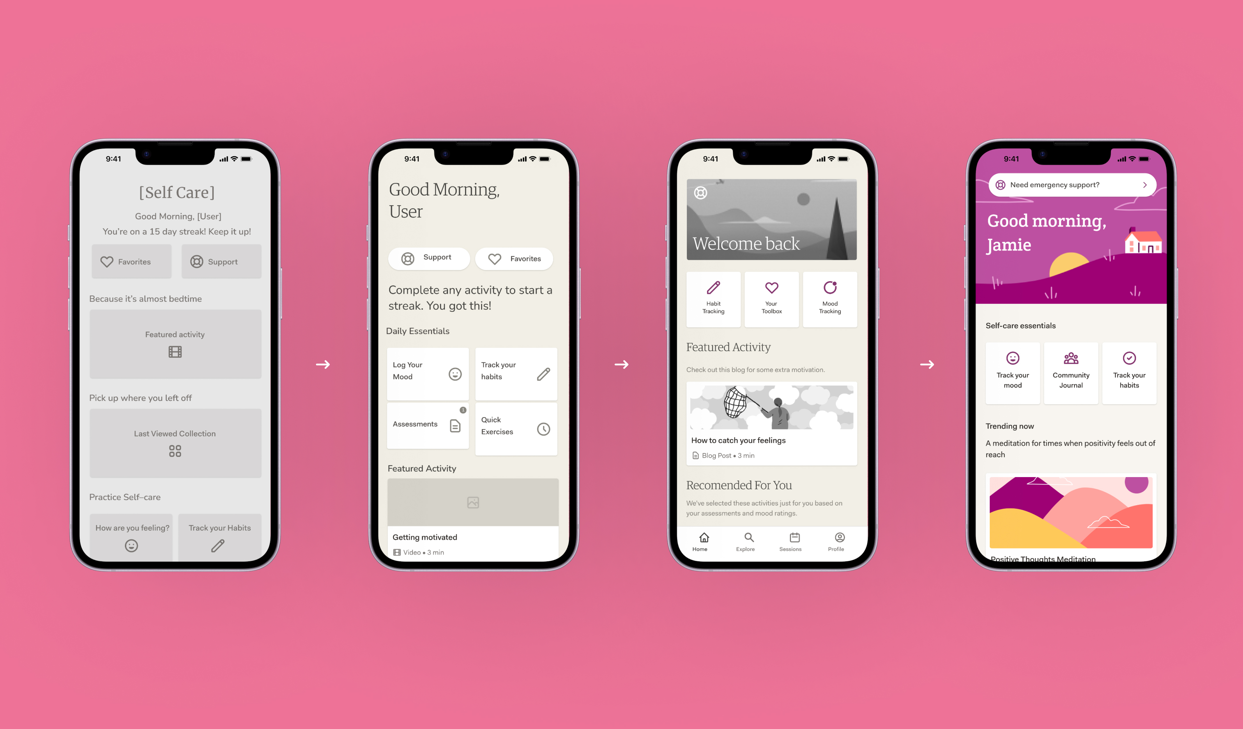 I started by creating a shared understanding of how users should navigate activities throughout our app. Sanvello's UX was pretty fragmented, with each feature utilizing a separate set of visual styles and UI conventions. This created a patchy experience for users and made the app extremely challenging for our engineers to work on.