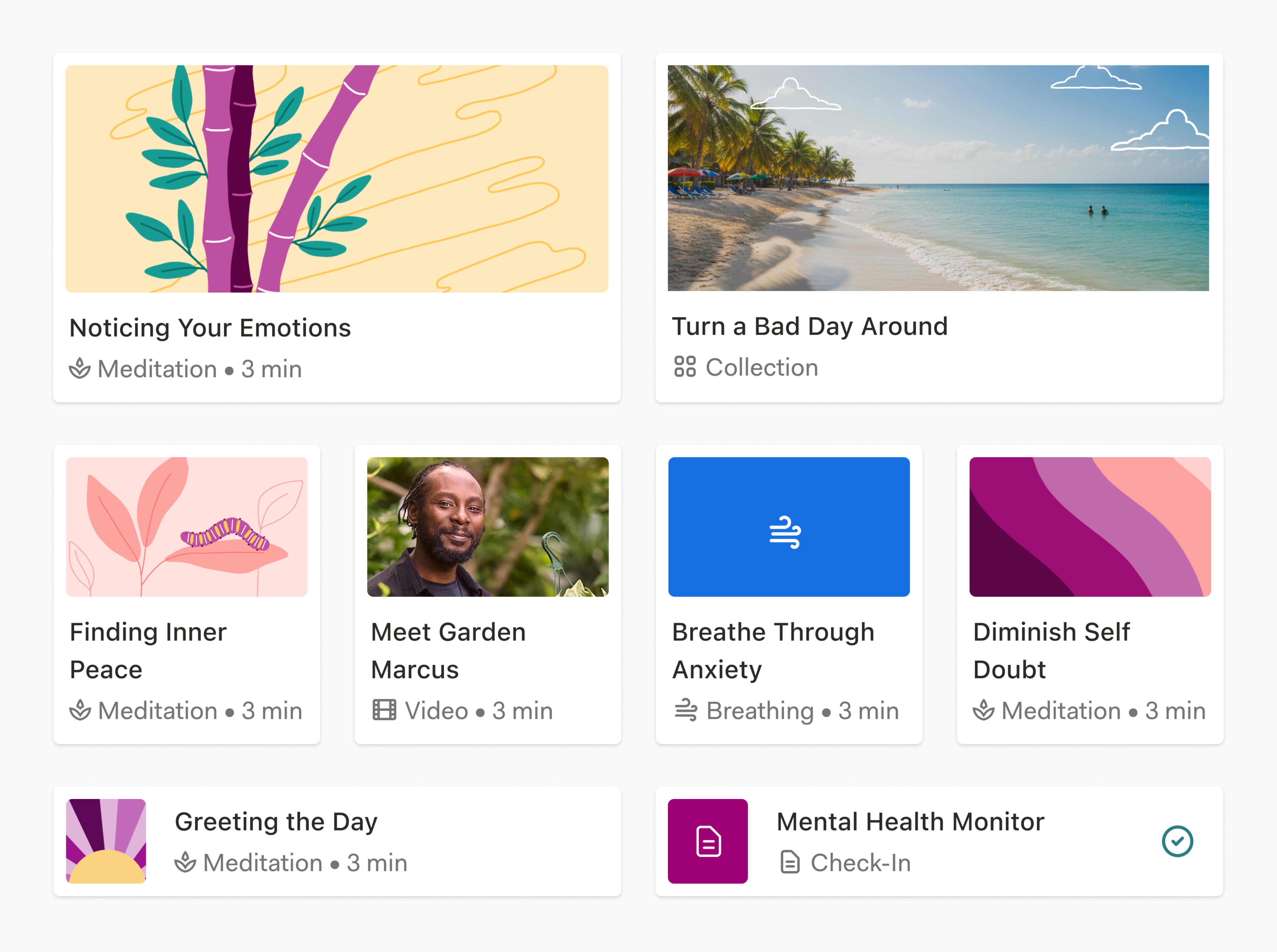 I designed an activity system (which we called The Activity System) to serve as the foundation for all of AbleTo's activities, creating familiar and consistent experiences while being flexible enough to accommodate a wide variety of activity types. This new activity system was built on modular intro and outro screens. The intro screens gave users options and modifiers before starting an activity, and the outro screens created a space to suggest new features to users, favorite activities they liked, and more.